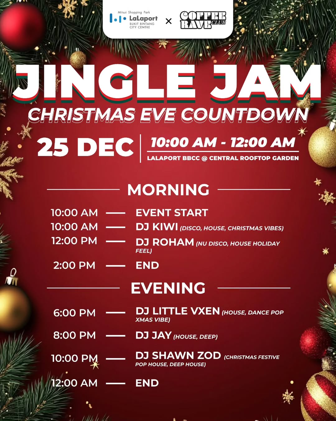 Get ready for the Jingle Jam! 🎢🌟 Join the Christmas Eve countdown at Lalaport BBCC with fantastic DJs spinning all day! From DJ Kiwi in the morning to DJ Shawn Zod’s festive vibes at midnight, it’s a party you won’t want to miss! Come for the beats, stay for the holiday cheer!