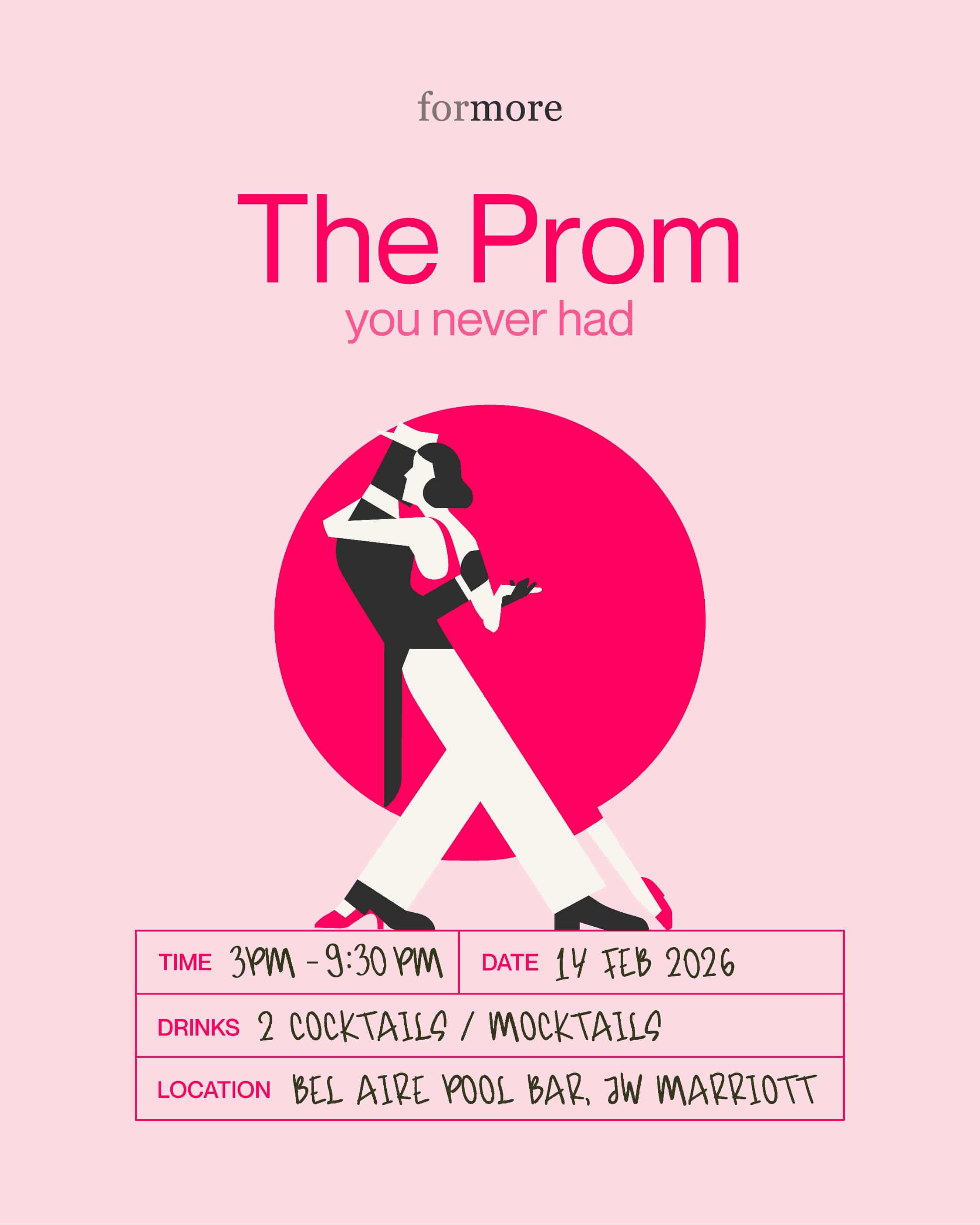 Get ready for an exciting night at The Prom! Join us at Bel Aire Pool Bar, JW Marriott, for a fun-filled event with 2 cocktails/mocktails included š¹. Perfect for reliving prom vibes or creating new memories. Don’t miss out, RSVP now!