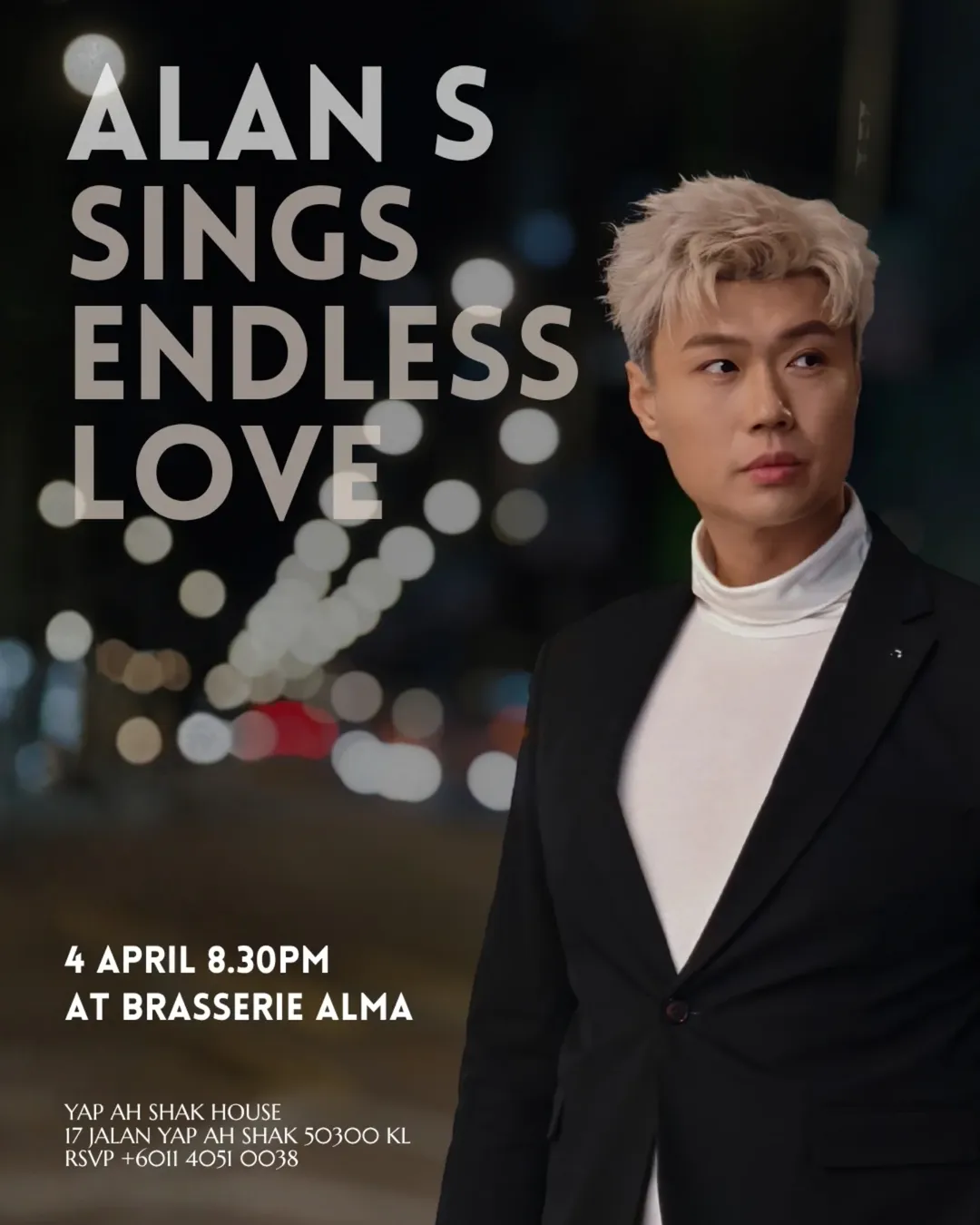 Get ready for a heartfelt night with Alan S performing his soulful rendition of ‘Endless Love’ at Brasserie Alma. This live concert promises an unforgettable experience filled with beautiful music and romantic vibes. Don’t miss this chance to see Alan S in action! Grab your tickets now at +6011 4051 0038 or visit the venue.