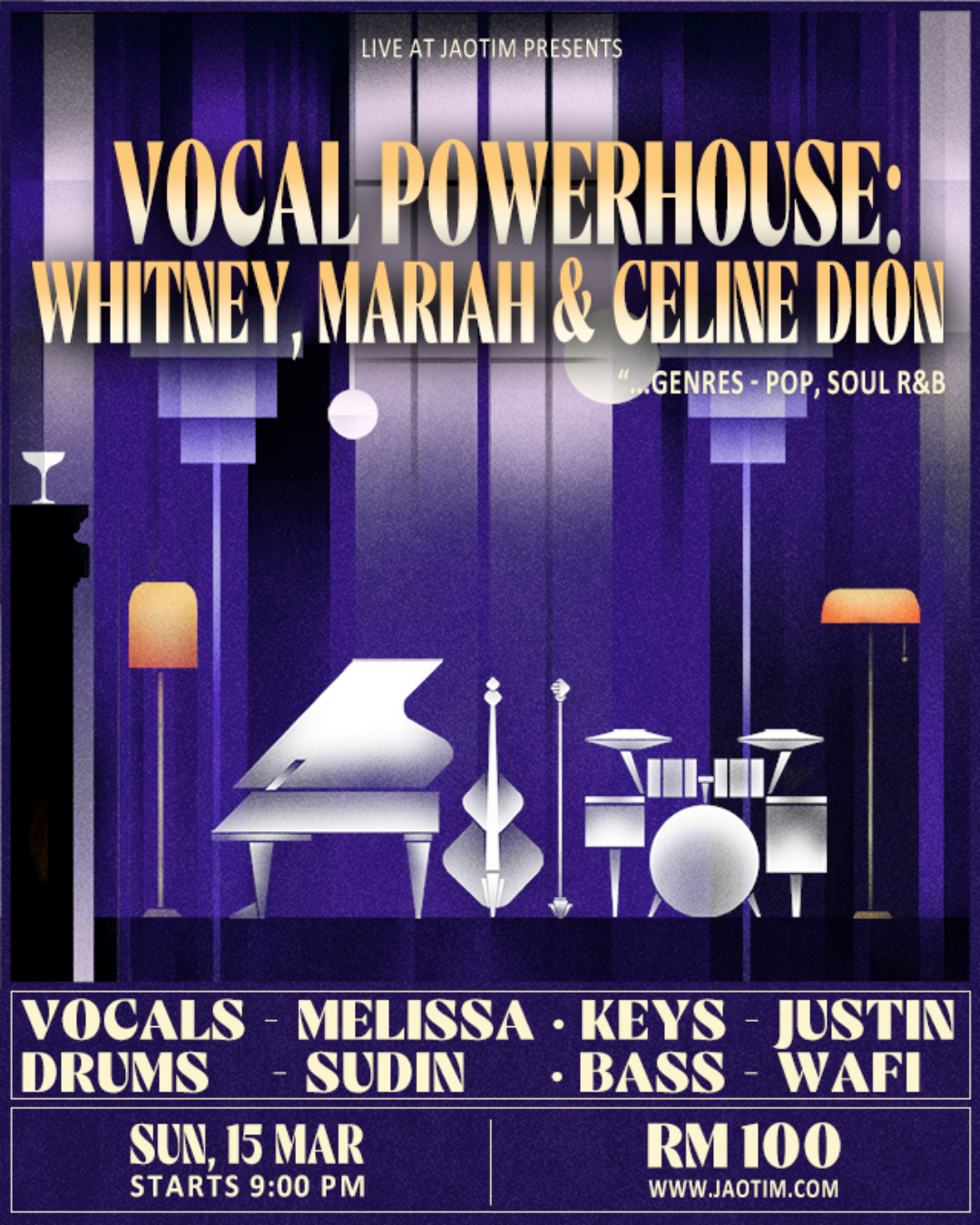 Get ready for a night of soulful singing and dazzling performances at JAOTIM with Whitney, Mariah, and Celine Dion! 🎶 Experience the magic of pop, R&B, and soul as Melissa, Keys, Justin, Sudin, Bass, and Wafi bring the house down. Don’t miss out on this vocal extravaganza! 🎤✨ Book your tickets now at www.jaotim.com!