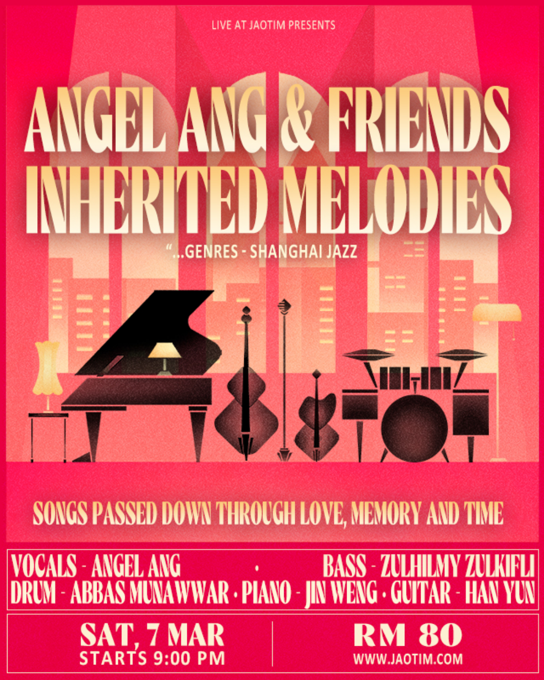 Get ready for a soulful night with Angel Ang & friends! Dive into genres like Shanghai jazz and timeless melodies that tell stories of love, memory, and time. Enjoy the vibrant atmosphere at Jaotim, with vocals by Angel Ang, bass by Zulhilmy Zulkifli, drums by Abbas Munawwar, piano by Jin Weng, and guitar by Han Yun. Don’t miss this musical journey! Grab tickets at www.jaotim.com.