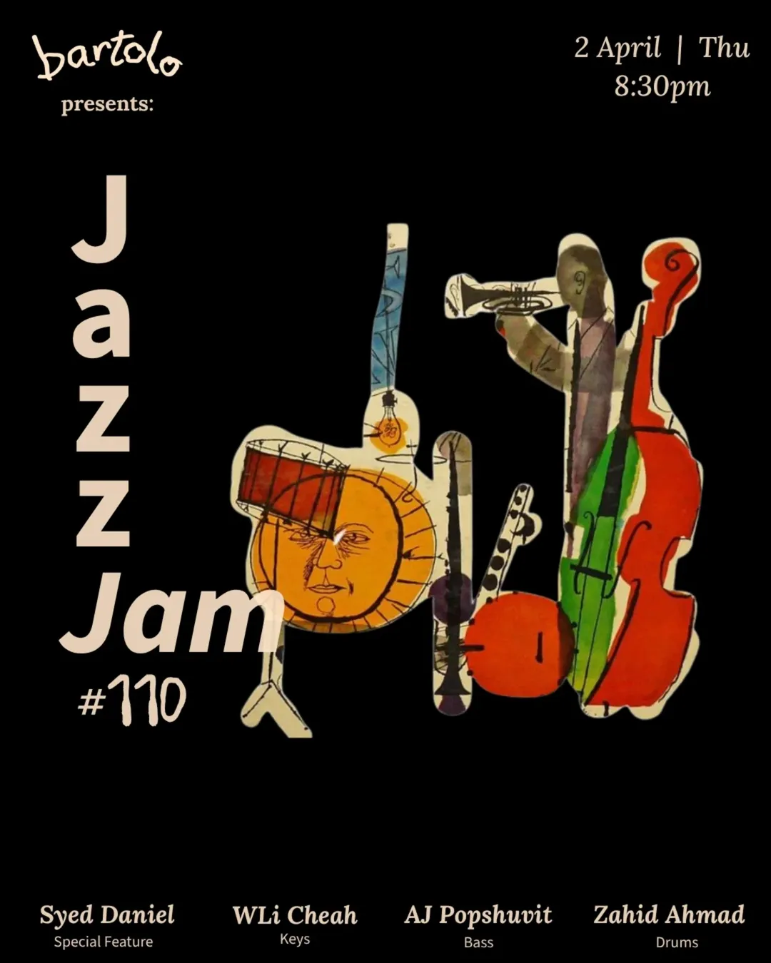 Join Jazz Jam #110 at Bartolo on April 2nd! Experience an evening of soulful jazz with talented musicians Syed Daniel, WLi Cheah, AJ Poshuvit, and Zahid Ahmad. Sip, sway, and enjoy the vibes in a cosy setting. Perfect for jazz lovers and friends! Don’t miss out!