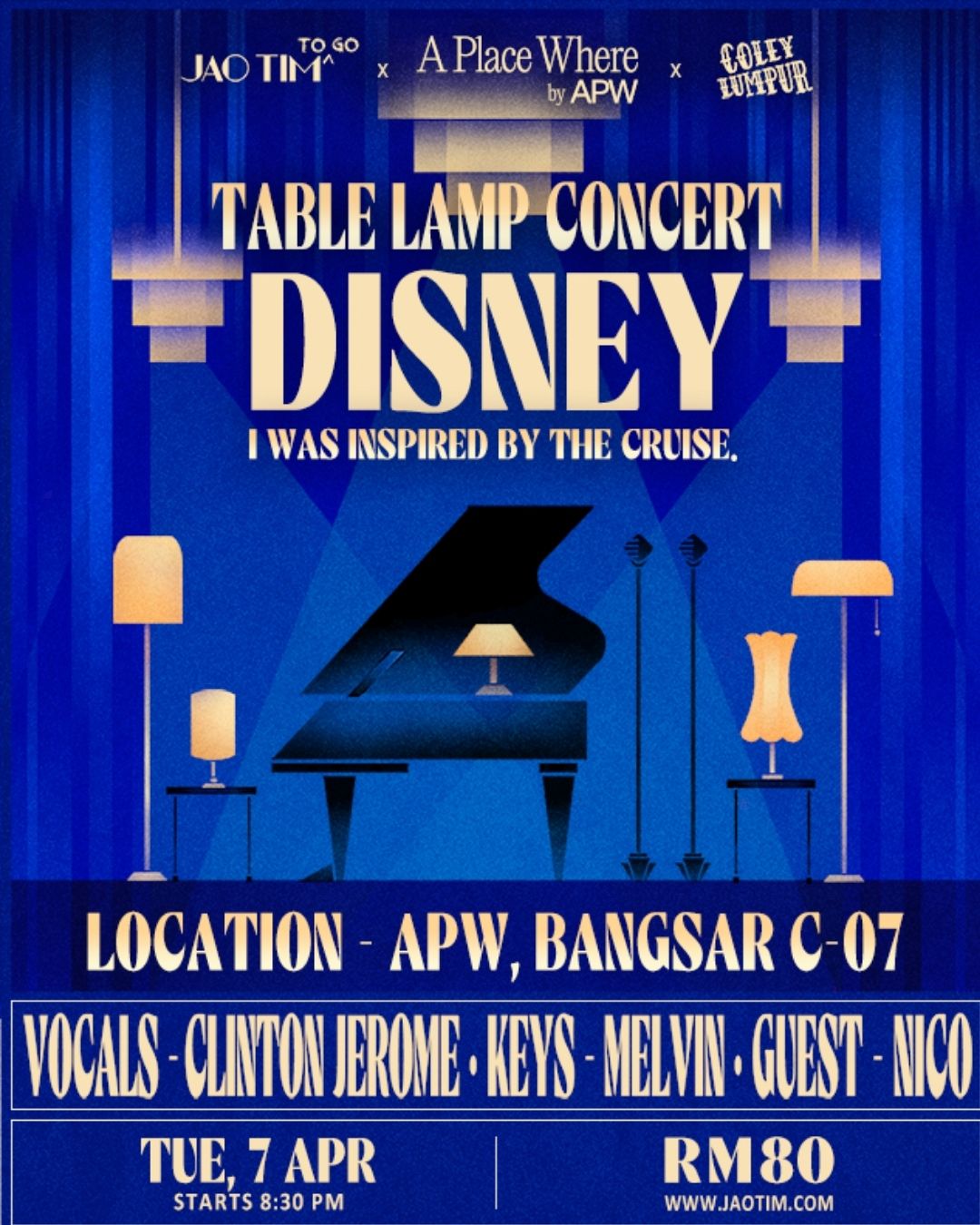 Get ready to be enchanted at the Disney-themed Table Lamp Concert! 🎶 Climb aboard a musical cruise inspired by Disney magic, featuring vocals by Clinton Jerome, keys by Melvin, and special guest Nico. Do not miss this enchanting night of melodies at APW Bangsar! 🎤✨ Grab your tickets now at www.jaotim.com.