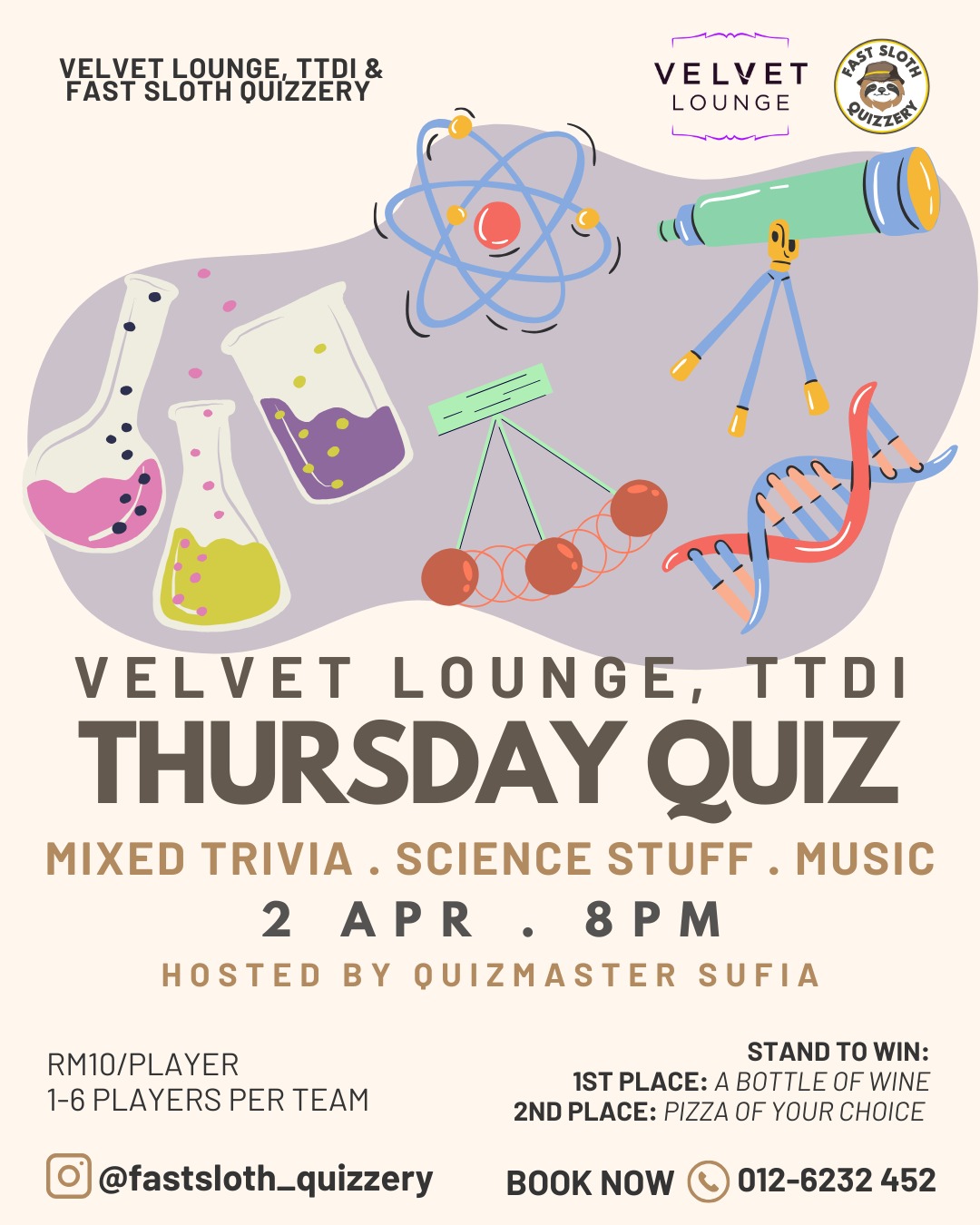 Mixed trivia, science stuff & music β hosted by Quizmaster Sufia. RM10/player, teams 1β6. Prizes are up for grabs. Donβt miss the fun, banter and bragging rights! β¨ Donβt miss out β Book your spot!