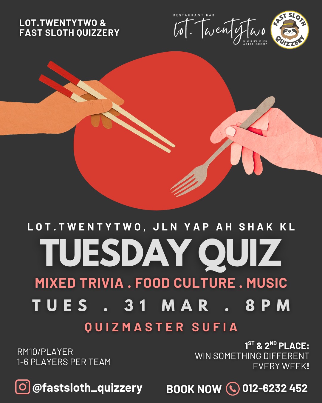 Join the fun with @fastsloth_quizzery at @lot.twenty.two for Tuesday Quiz! Enjoy mixed trivia, food culture, and music every week. Win cool prizes and challenge your friends! π§ πΆπ Book your spot now!