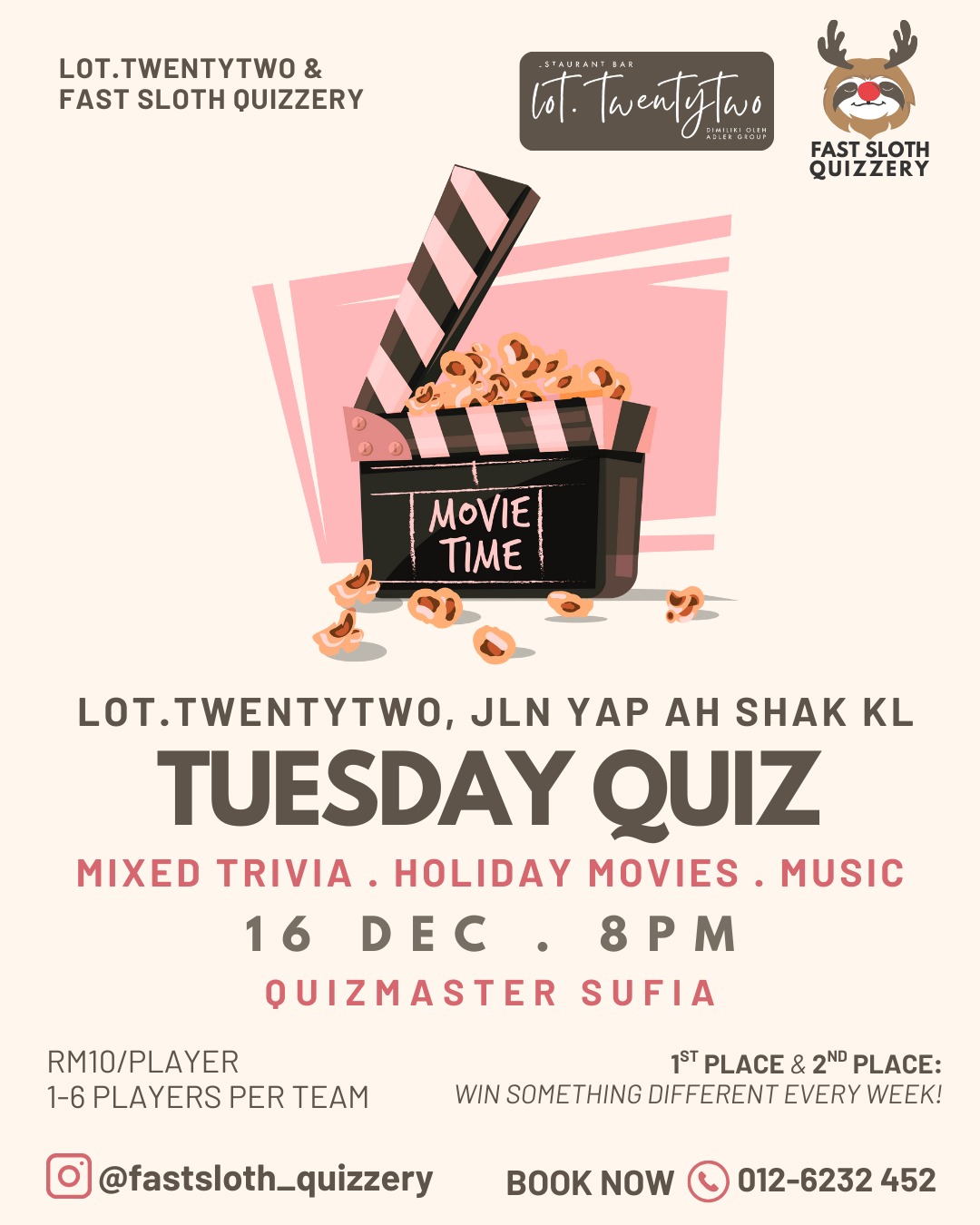 Get ready for a night of fun at the Tuesday Quiz! 🎉 Join Quizmaster Sufia for a mixed trivia challenge featuring holiday movies and music. 💡🍿 Gather your team (up to 6 players) for just RM10 each and stand a chance to win exciting prizes! 🏆✨