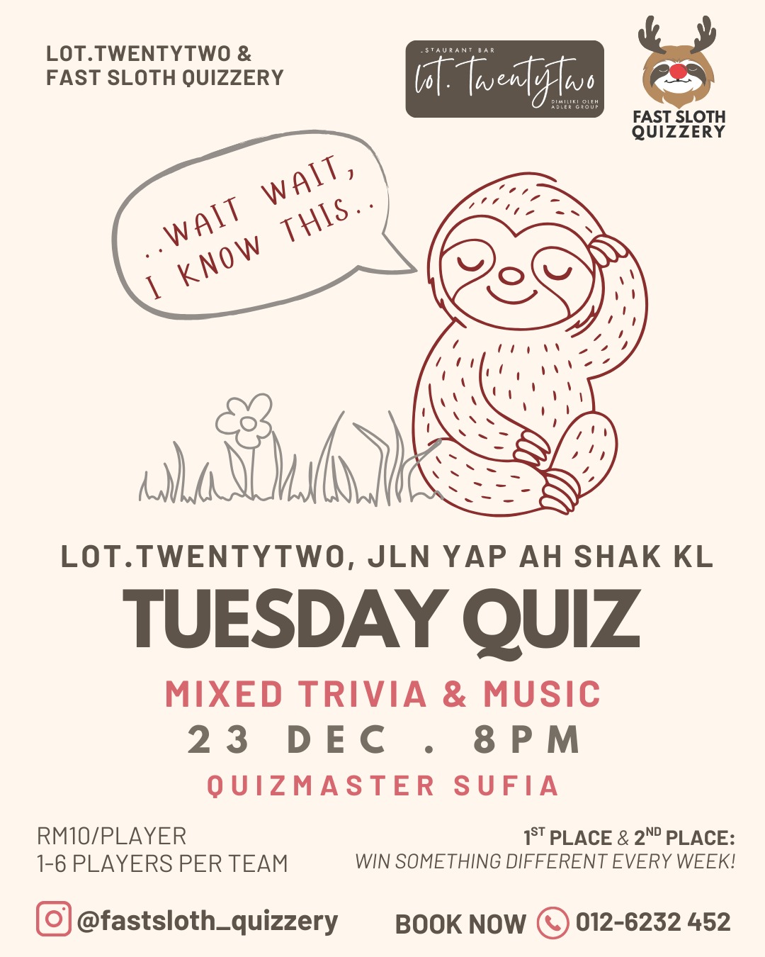 Join @fastsloth_quizzery at Lot.TwentyTwo for a night of trivia that’s as fun as a sloth on a tightrope! 🎉 Test your knowledge and enjoy great music with Quizmaster Sufia. Form a team of up to 6 players and win exciting prizes every week! 🏆 Don’t miss out on the fun!